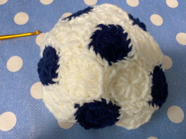 この間編んだサッカーボールのおもちゃ、今度は色を変えて編み始めました。