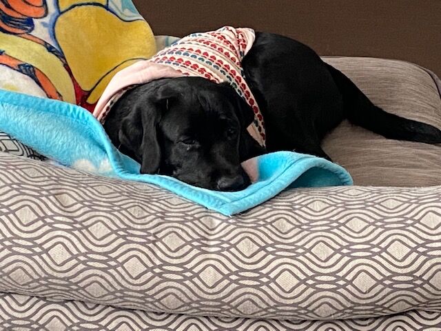 ママの手編みのブランケットをかけてお家を出る準備をしました。