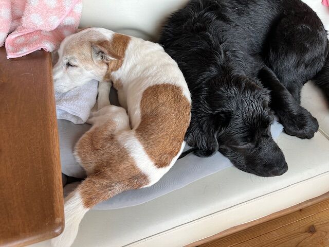 シャンプー後のレーちゃんとシーちゃん、寝ている凪くん。