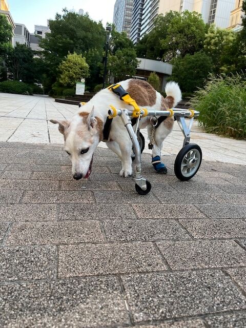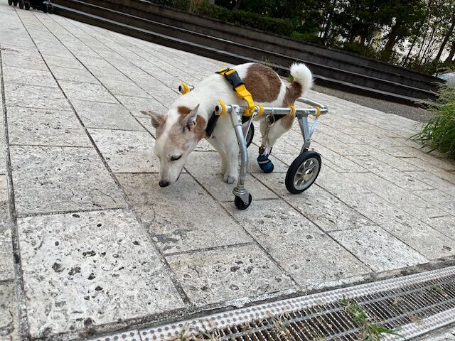 片方の前足に力が入りにくいので、軸足を元にクルクル回るように歩きます。